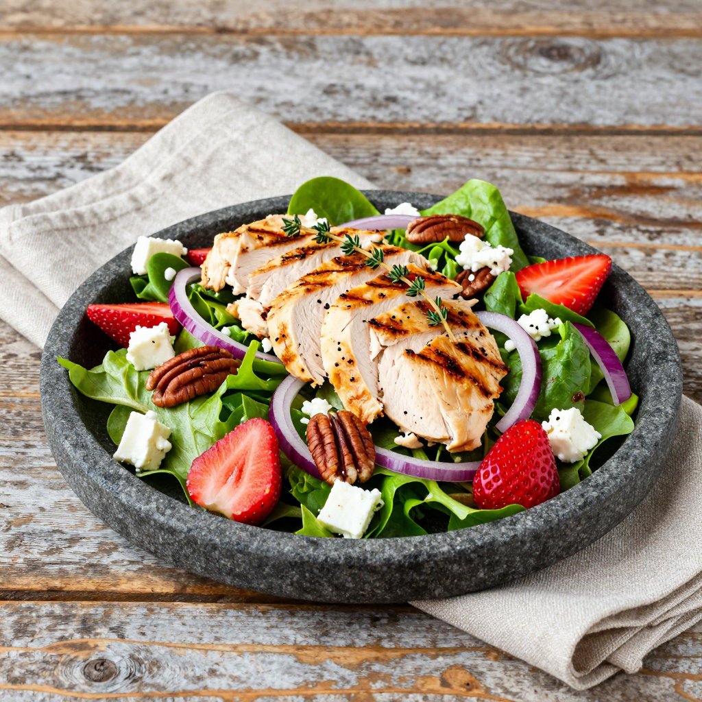 - In a bowl, combine greens, strawberries, pecans, red onion, and goat cheese. Top with sliced chicken.