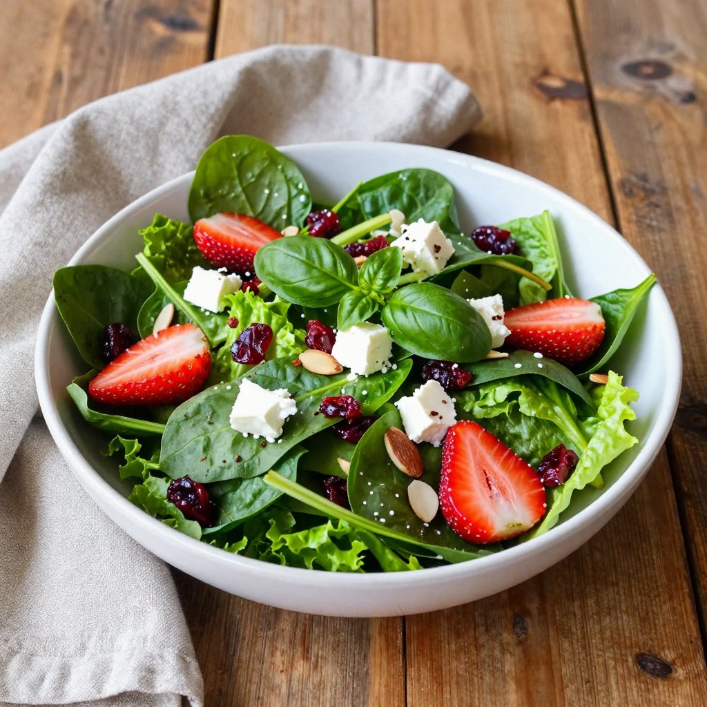 - Top the greens with the chopped strawberries, dried cranberries, sliced almonds, and feta cheese.